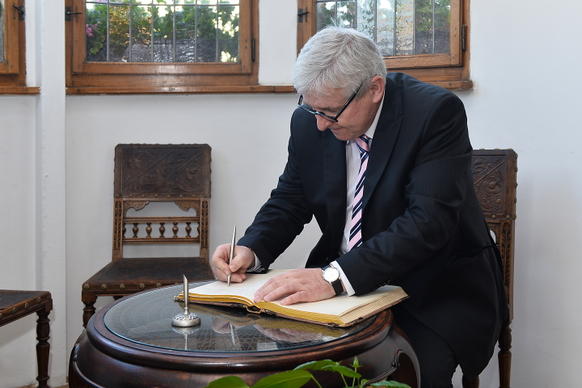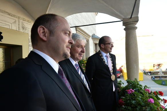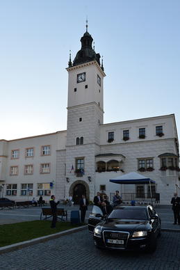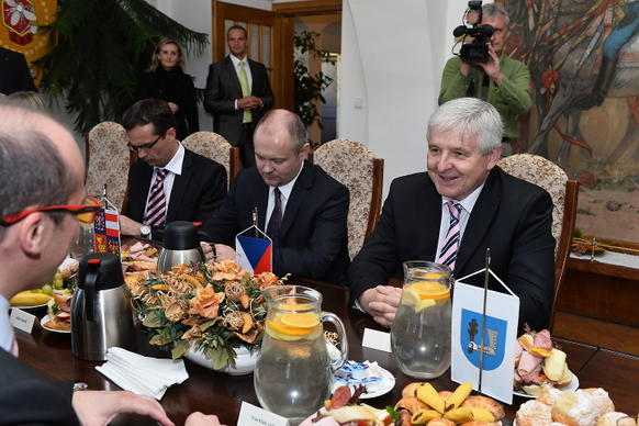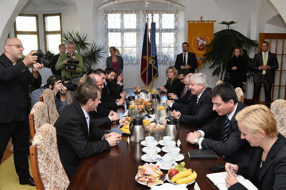 Následně premiér zamířil na městský úřad, kde jej uvítal starosta obce a ministr pro místní rozvoj František Lukl. Přítomen na jednání byl i jihomoravský hejtman Michal Hašek.