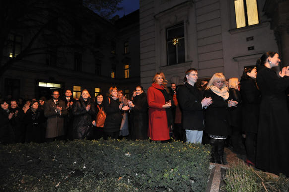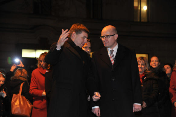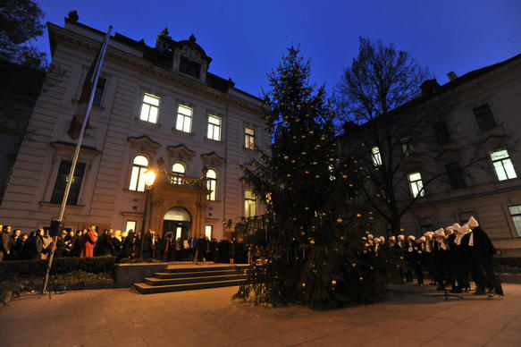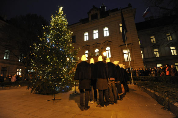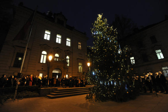Předseda vlády Bohuslav Sobotka a vedoucí Úřadu vlády ČR Pavel Dvořák společně se zaměstnanci rozsvítili ve čtvrtek 11. prosince 2014 vánoční strom před Strakovou akademií.