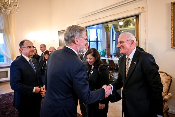 Předseda vlády v demisi Petr Fiala se ve středu 19. listopadu 2025 v Kramářově vile setkal s prezidentem Albánské republiky Bajramem Begajem. Hlavními tématy jednání byla aktuální mezinárodní situace, průběh přístupových jednání Albánie o vstupu do Evropské unie a hospodářská spolupráce. Premiér ocenil dynamický rozvoj česko-albánských vztahů i roli Albánie při posilování stability na západním Balkáně.