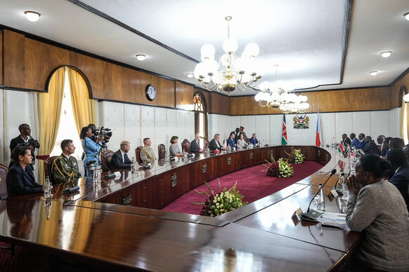 Po přijetí keňským prezidentem zamířil Petr Fiala na jednání s ministrem obrany Keni Adenem Dualem a dalšími představiteli tamní armády včetně náčelníka generálního štábu. „Jednání se týkalo bezpečnostních otázek a spolupráce, která zde mezi našimi armádami již funguje. Pochopitelně jsme hovořili o tématech, která se týkají modernizace armády, která je příležitostí pro náš obranný průmysl,“ řekl po jednání český předseda vlády.