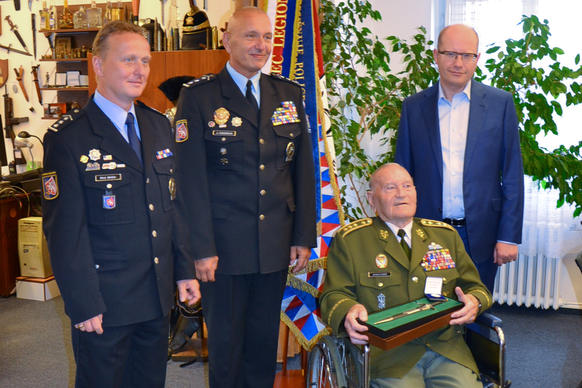 Premiér zároveň předal generálovi Klemešovi pamětní minci předsedy vlády České republiky.