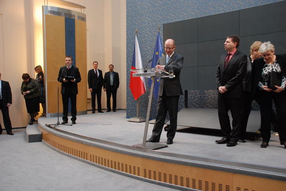 Předseda vlády Bohuslav Sobotka pozdravil v úterý 4. února 2014 pracovníky Úřadu vlády a seznámil je s novým vedením Strakovy akademie.