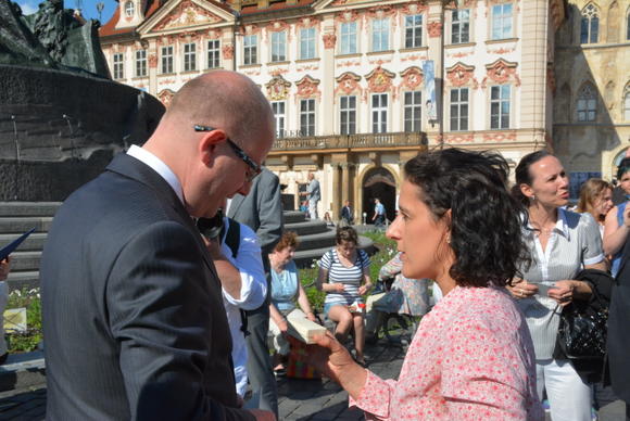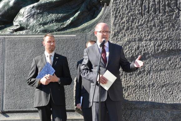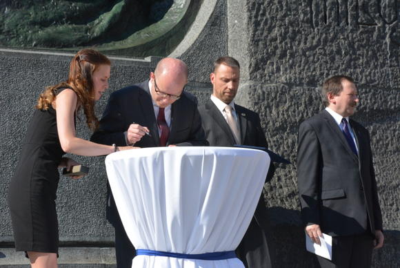 Premiér také podepsal pamětní listinu, která byla spolu s titulními stránkami novin a pamětními předměty uložena do schránky u základního kamene sousoší.